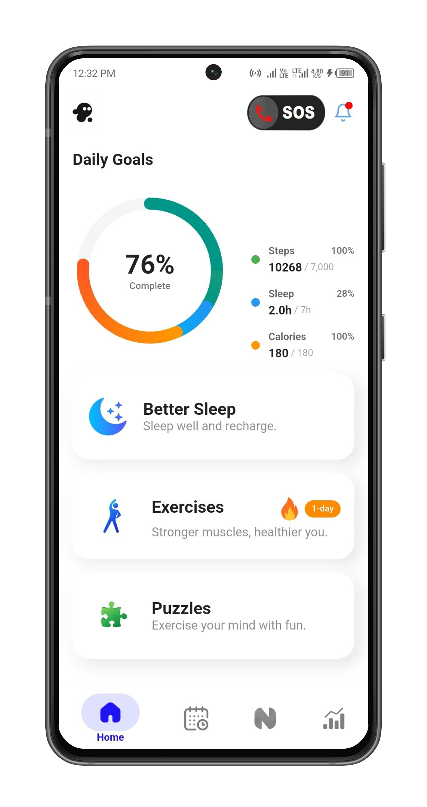 We keep the mind active with adaptive cognitive puzzles and the body moving with senior-safe workouts. Novaq isn't just a monitor; it's a wellness coach that makes aging fun.